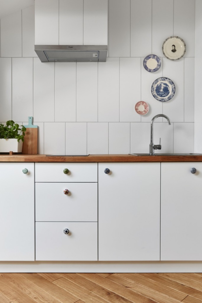 Căn bếp nhỏ nhưng vô cùng tinh tế và độc đáo nhờ những núm cửa tủ lạ mắt và những chiếc
